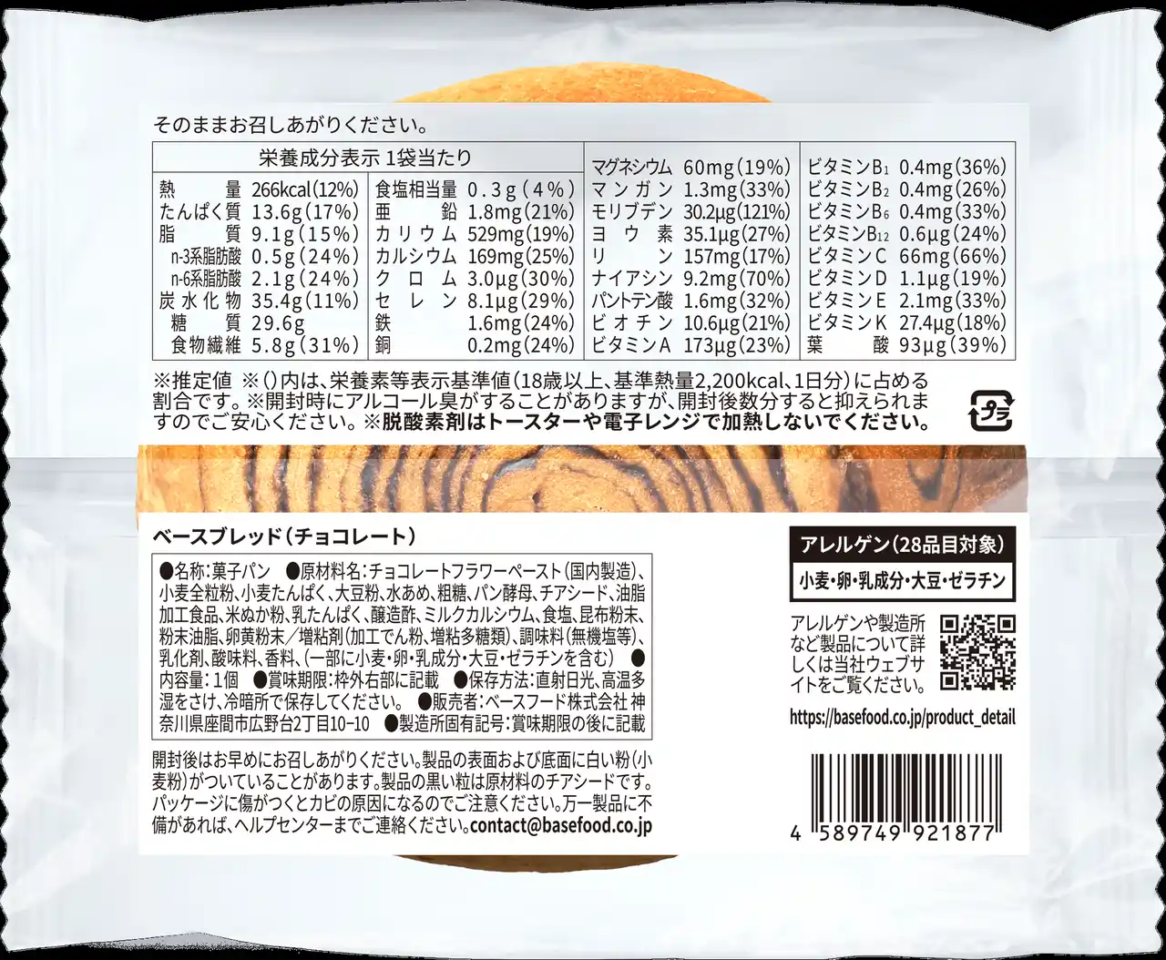 完全栄養の主食※2「BASE FOOD」等を開発・販売するベースフード株式会社(本社:東京都目黒区、代表取締役:橋本舜、https://basefood.co.jp)は、1食(2袋)で1日に必要な33種類の栄養素の1/3がバランスよくとれる完全栄養のパン※3「BASE BREAD(ベースブレッド)」シリーズの内、「BASE BREAD チョコレート」を2026年3月30日(月)製造分より順次リニューアルします。 |
