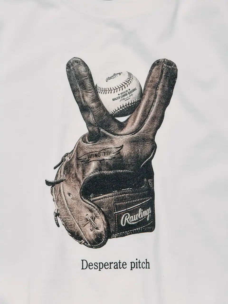 「DESPERATE PITCH(やけくそピッチ)」投手として160kmの速球を投げ、打者として本塁打王を獲得するなど、二刀流で世界を驚かせる現代のBASEBALL界。その次に驚かせるには、グラブで投げるしかない。そんなジョークを落とし込んだデザイン。 |