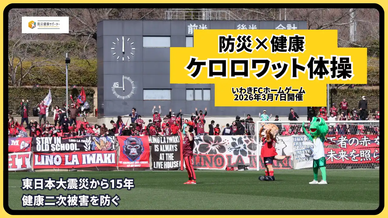 一般社団法人 生涯健康社会推進機構(所在地:東京都渋谷区)は、いわき市およびいわきFCと連携し、2026年3月7日(土)に開催された「明治安田J2リーグ 第5節 RB大宮アルディージャ戦」において、防災と健康づくりをテーマとした啓発活動を実施しました。 |