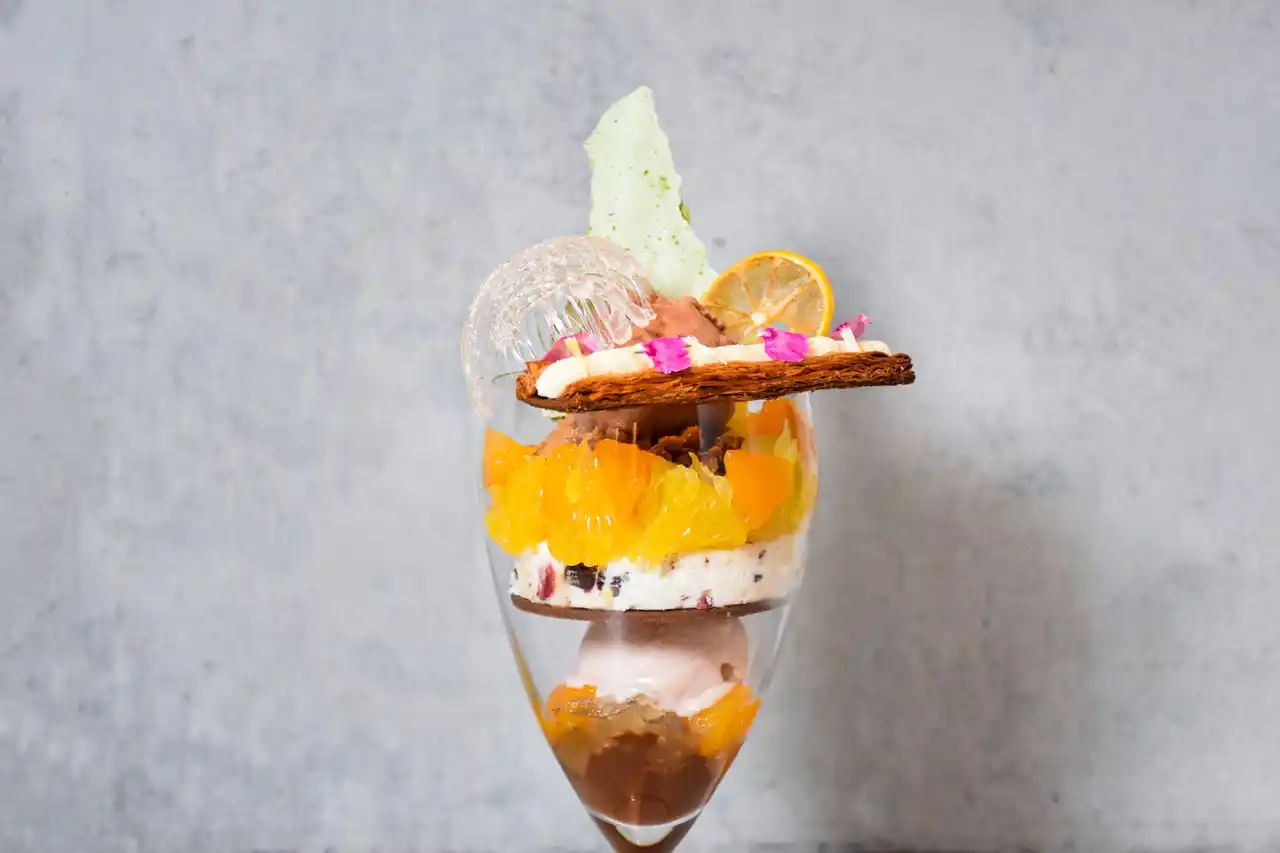 ジューシーな旬の甘夏みかんと清見オレンジ、そして香り豊かなチョコレートを主役に据え、全15パーツが幾層にも重なり合う贅沢なパフェが完成しました。 |