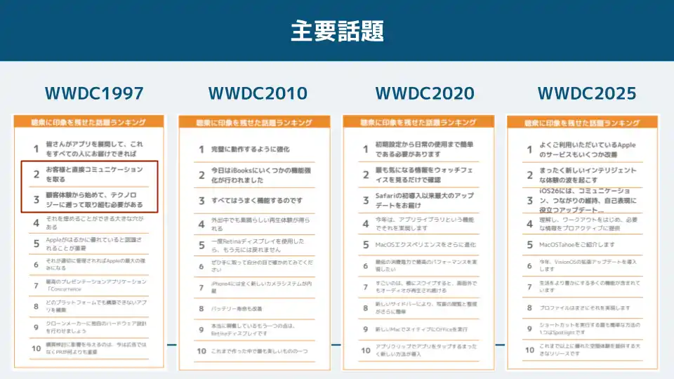 【読み取れること】WWDC1997とWWDC2025では、話題数が絞られて掘り下げもほぼすべての話題に対して行われているのに対し、WWDC201・ 2020では、話題数も掘り下げのない話題も多く出ています。 |