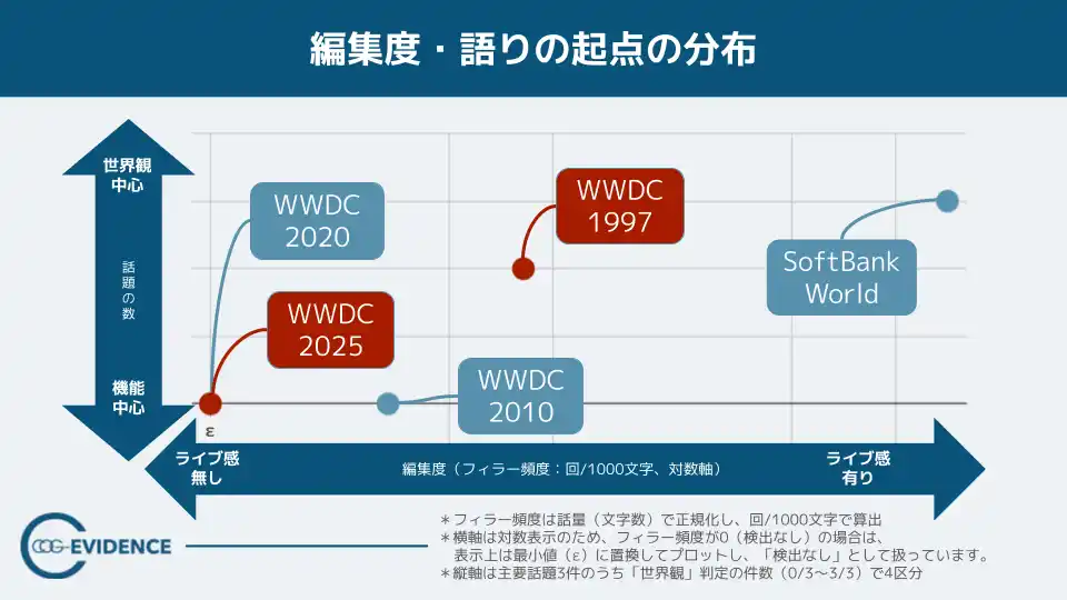 これらを、「編集度 × 語りの起点」の2軸で表される分布図上にプロットすると(図6)、WWDC1997と2025は明らかに異なる位置に分布しており、WWDC1997は“世界観側から入り、ライブ感が強い回”、WWDC2025は“機能側から入り、編集度が高い回”として整理可能になります。 |