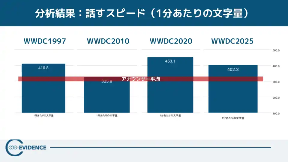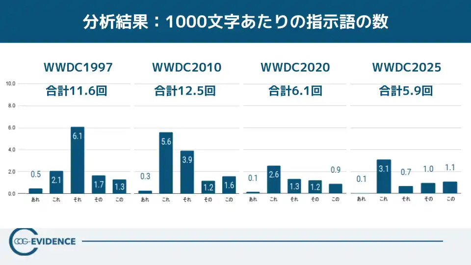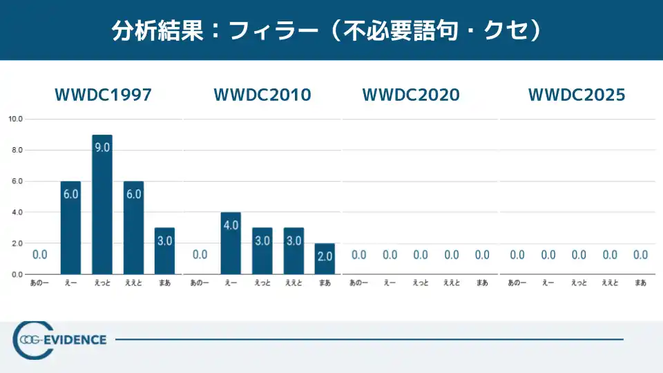 【読み取れること】WWDC1997は指示語・フィラーが多く、会場との緊張感を残した“ライブ感の強い提示”になっています。一方でWWDC2025はフィラーがほぼ検出されず、WWDC1997と同程度の話速でも“整理された提示”として成立しています。 |