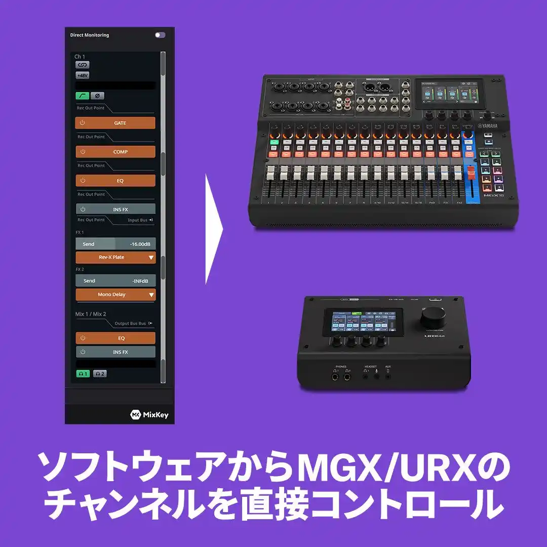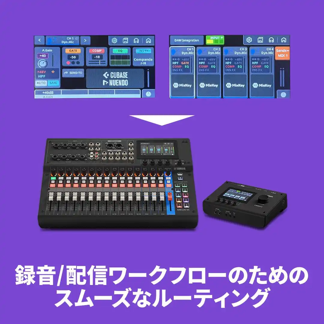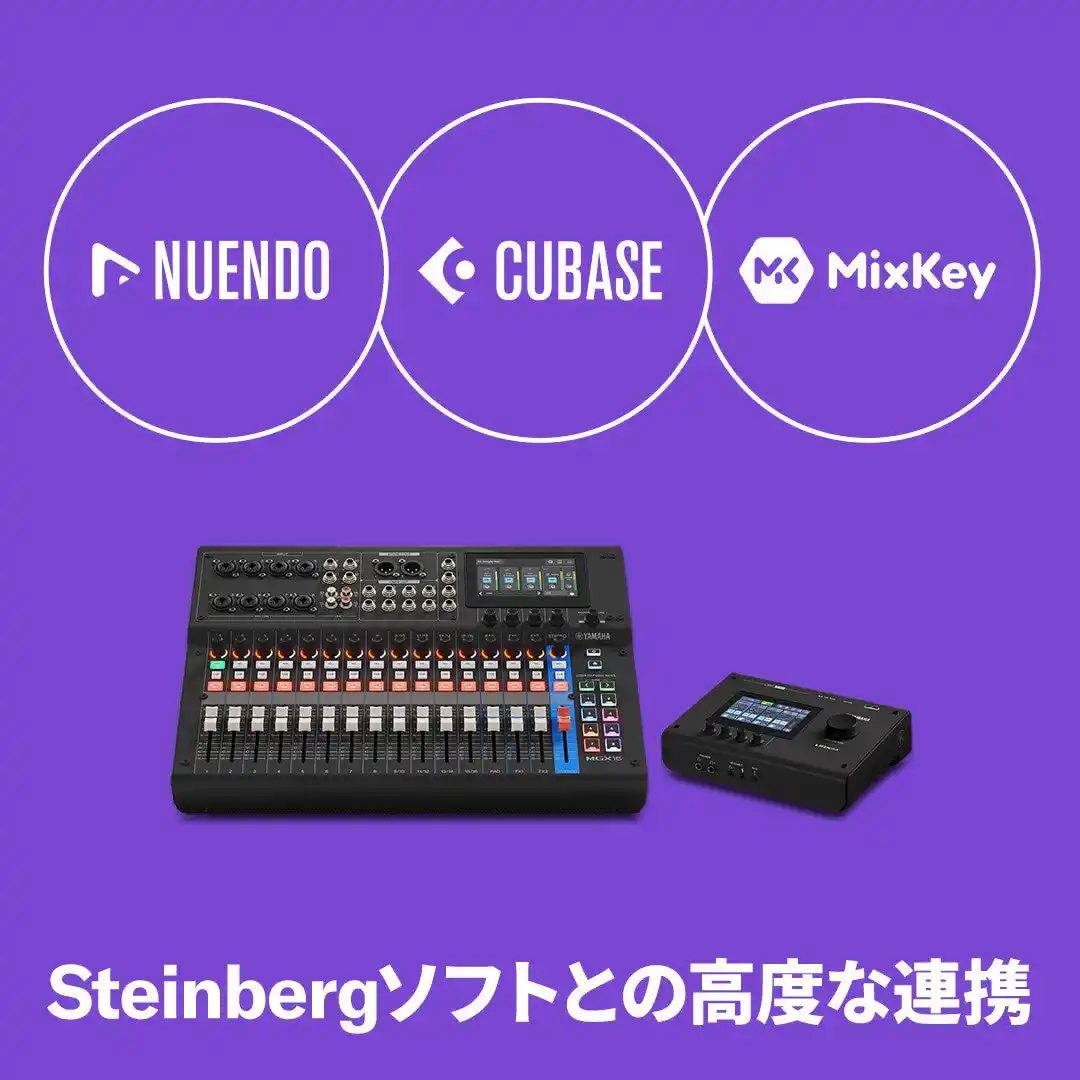 「MGXシリーズ」「URXシリーズ」とスタインバーグのデジタル・オーディオ・ワークステーション(DAW)「Cubase(キューベース)」「Nuendo(ヌエンド)」、およびストリーマーやクリエイターのためにデザインされたオーディオソフトウェアミキサー「MixKey」との連携機能を追加しました。これにより、ヤマハのハードウェアとスタインバーグのソフトウェアを組み合わせた、よりシームレスな制作環境を構築できます。ライブPAや設備音響、レコーディング、配信、コンテンツ制作など、幅広い用途で洗練されたワークフローを提供します。 |