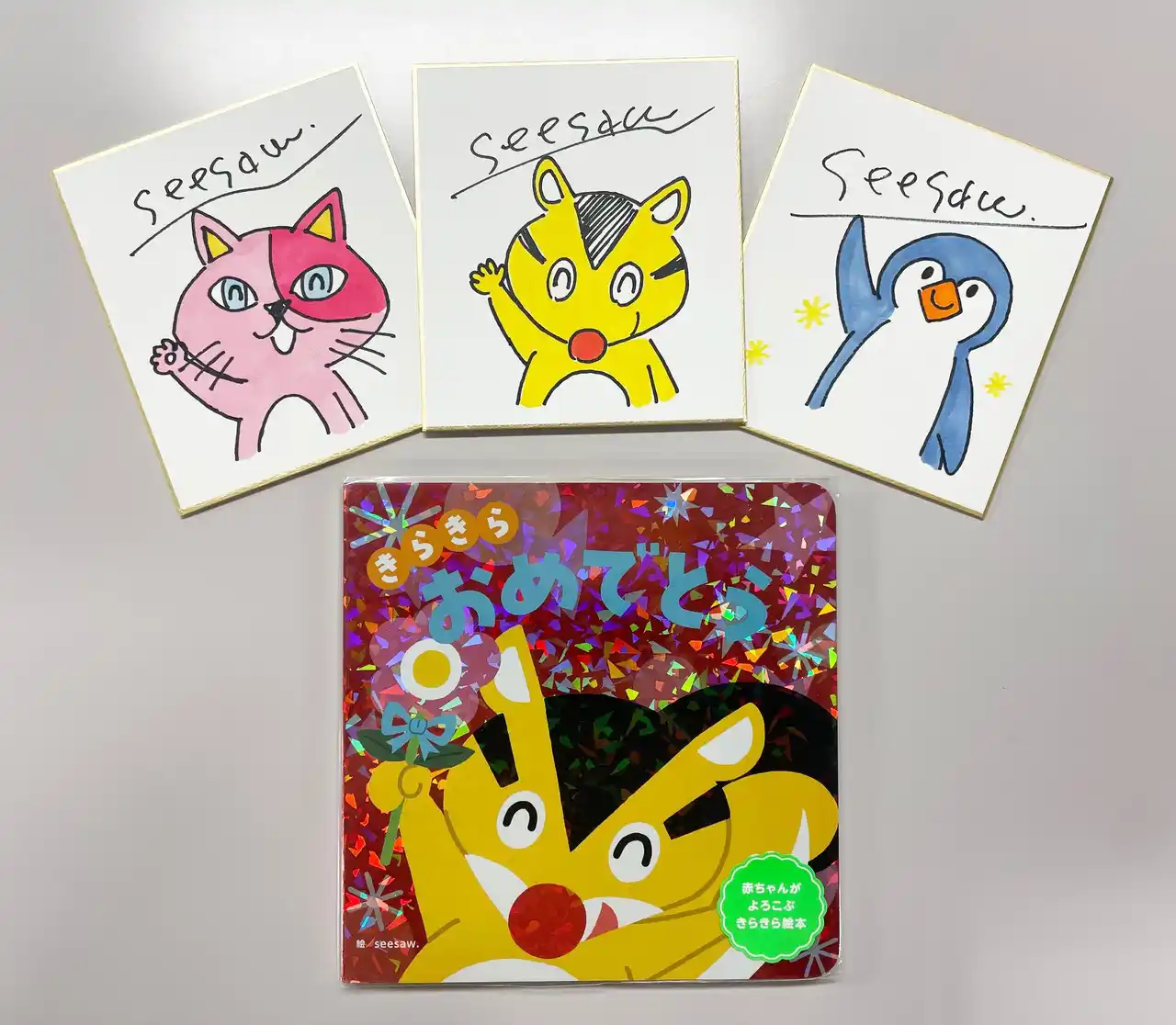 東京書店株式会社(東京・虎ノ門/代表取締役:鈴木伸也)は、きらきら楽しい絵本『きらきら おめでとう』の作家ユニット、seesaw.が製作したオリジナルの色紙を絵本とセットで絵本ナビサイト内にて3月25日(水)より発売しましたことをお知らせします。 |