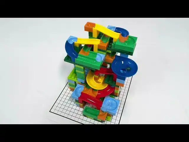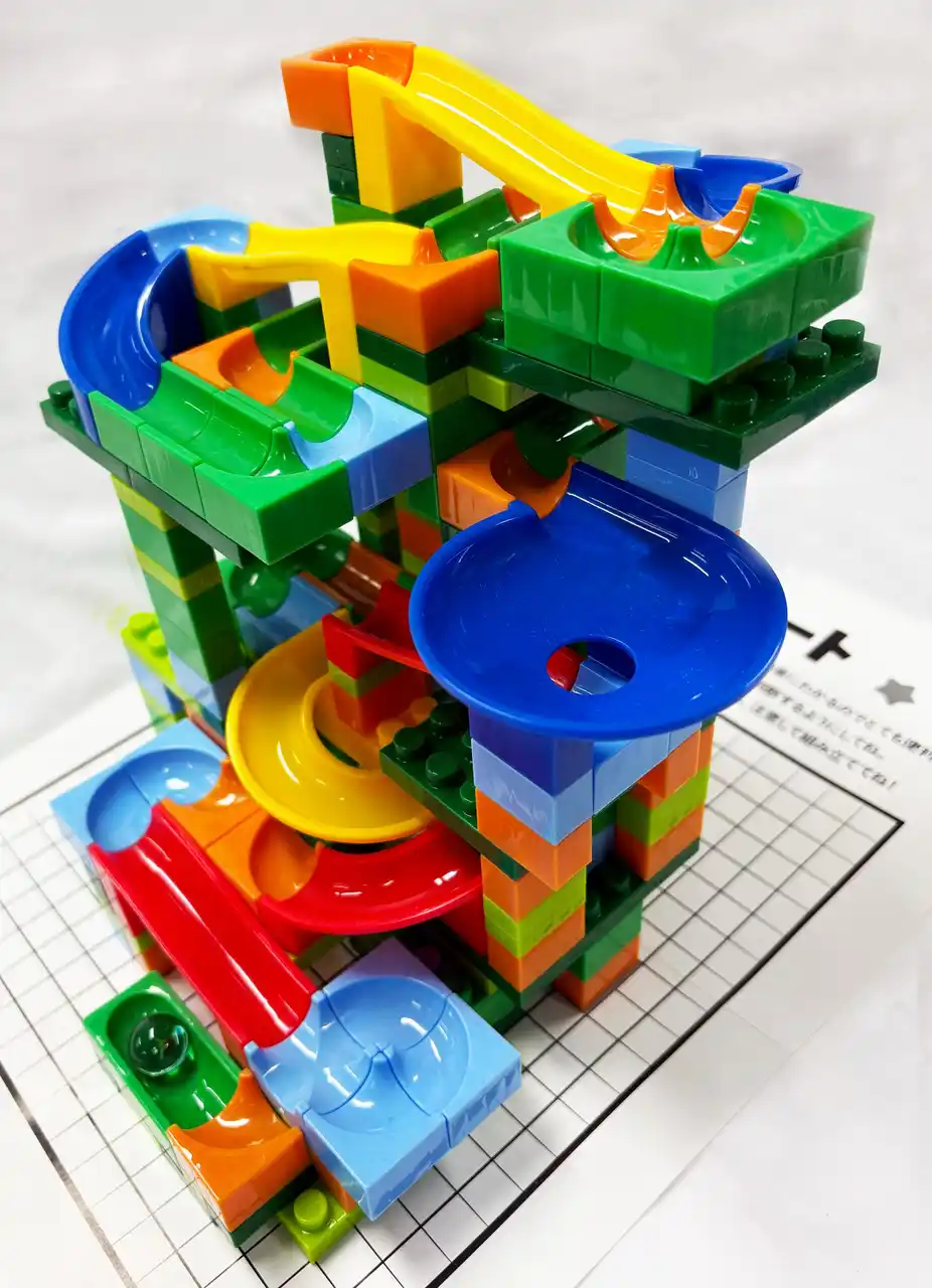 ブロックを組み立ててコースを作り、ビー玉を走らせて遊ぶ知育ブロックキットです。 |