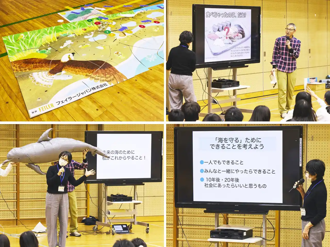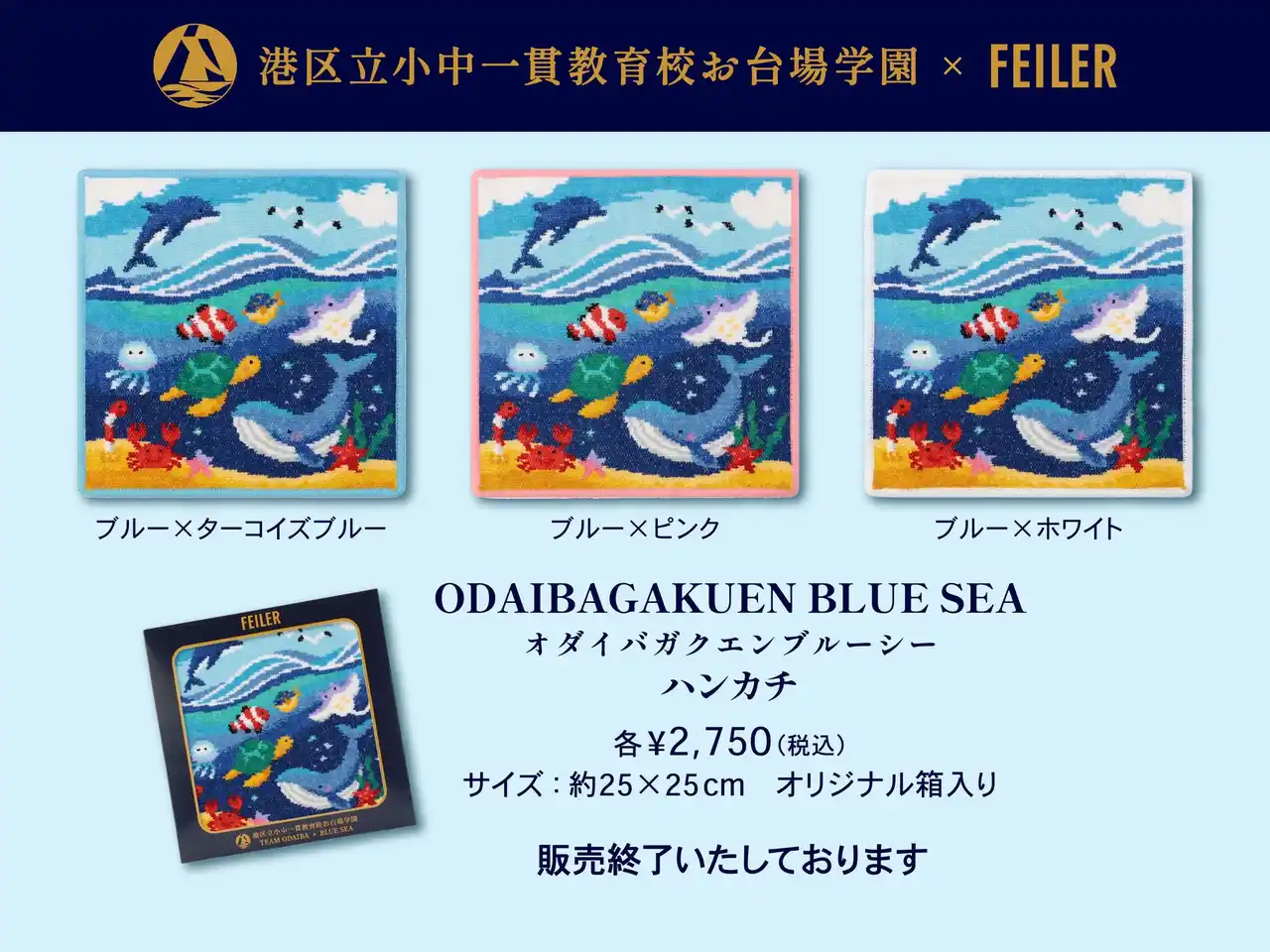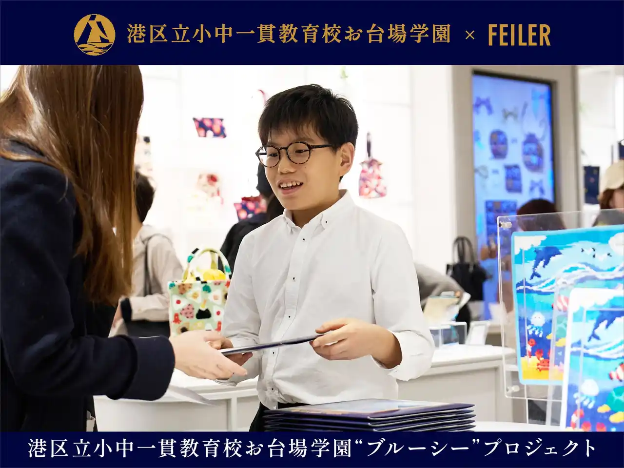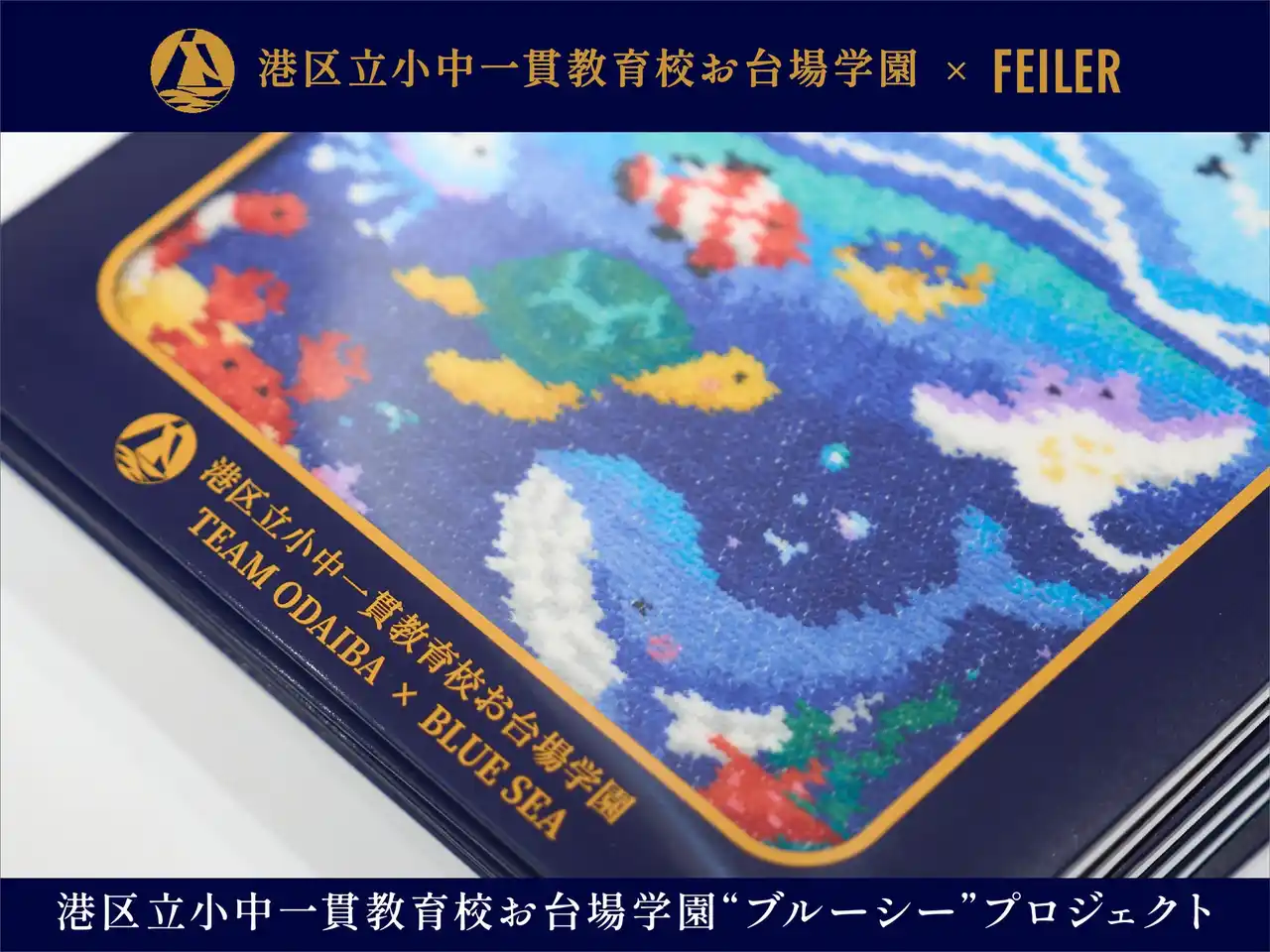 フェイラージャパン株式会社(本社:東京都渋谷区、代表取締役社長:八木直久)は、お台場の海のすぐそばに位置する港区立小中一貫教育校お台場学園の海に関する学習や特色ある学習をとおして子供たちが得た「海の環境を守る大切さ」を発信したい、という想いに共感し、2025年2月から小学6年生(当時5年生)と共創し、「FEILER(フェイラー)」のハンカチをとおして「海の環境を守る大切さ」を発信する“ブルーシー”プロジェクトを実施いたしました。 |