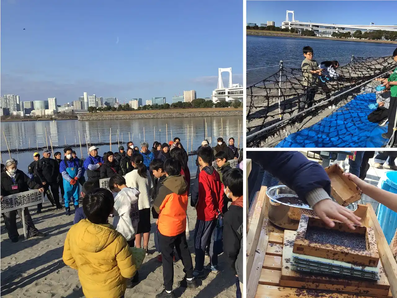 お台場学園は目の前に海が広がる都内唯一の学校です。地引き網体験や海苔づくり、ビーチバレーボールの学習など、お台場の自然環境を生かした学習が行われています。環境学習を通して子供たちの中で、「海を守りたい」という思いが育まれています。 |
