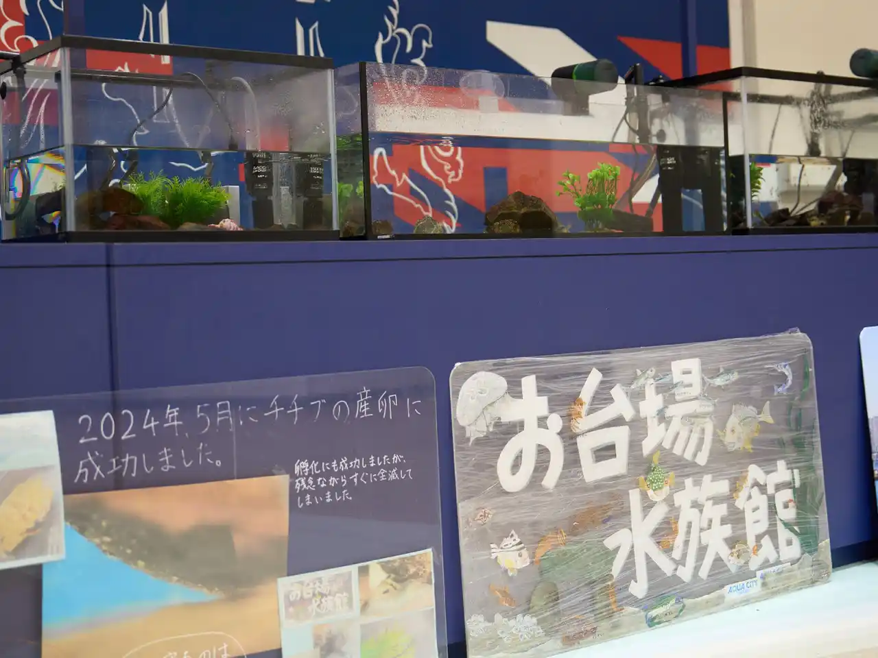 1Fのエントランスには、お台場の海の魚を展示した子ども達がつくった「お台場水族館」があります。来校者などどなたでも鑑賞可能になっています。 |