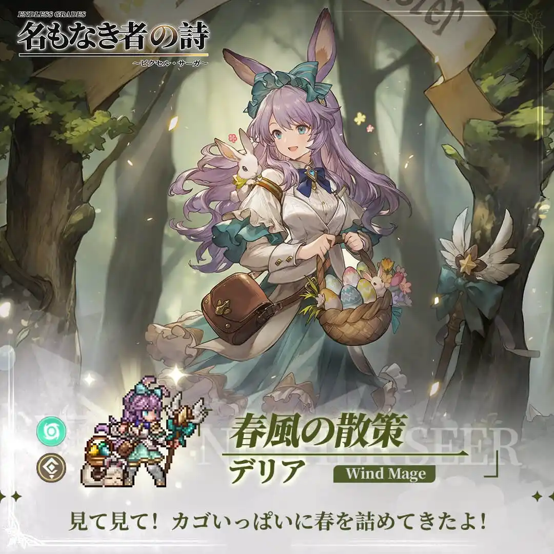 イースターの陽気な雰囲気を纏った、デリアの愛らしい春の私服。うさ耳のヘッドドレスと、パステルカラーのフリルが揺れるドレスが、春風の中を軽やかに駆ける彼女にぴったりです。 |