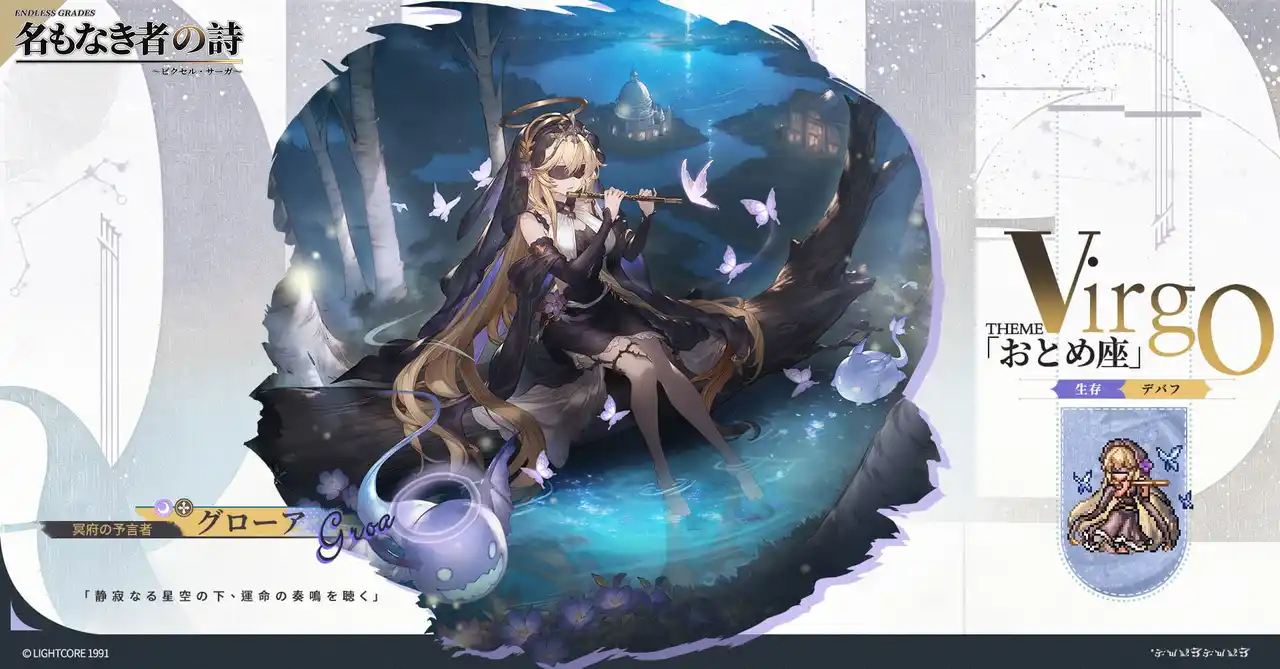 イベント期間中にグローアをランク15まで昇格させることで獲得できる限定コスチューム「おとめ座」。漆黒のドレスを纏い、聖域の森で星々を導く指揮者のように骨笛を奏でる、グローアの神秘的な一面を解放しましょう。 |