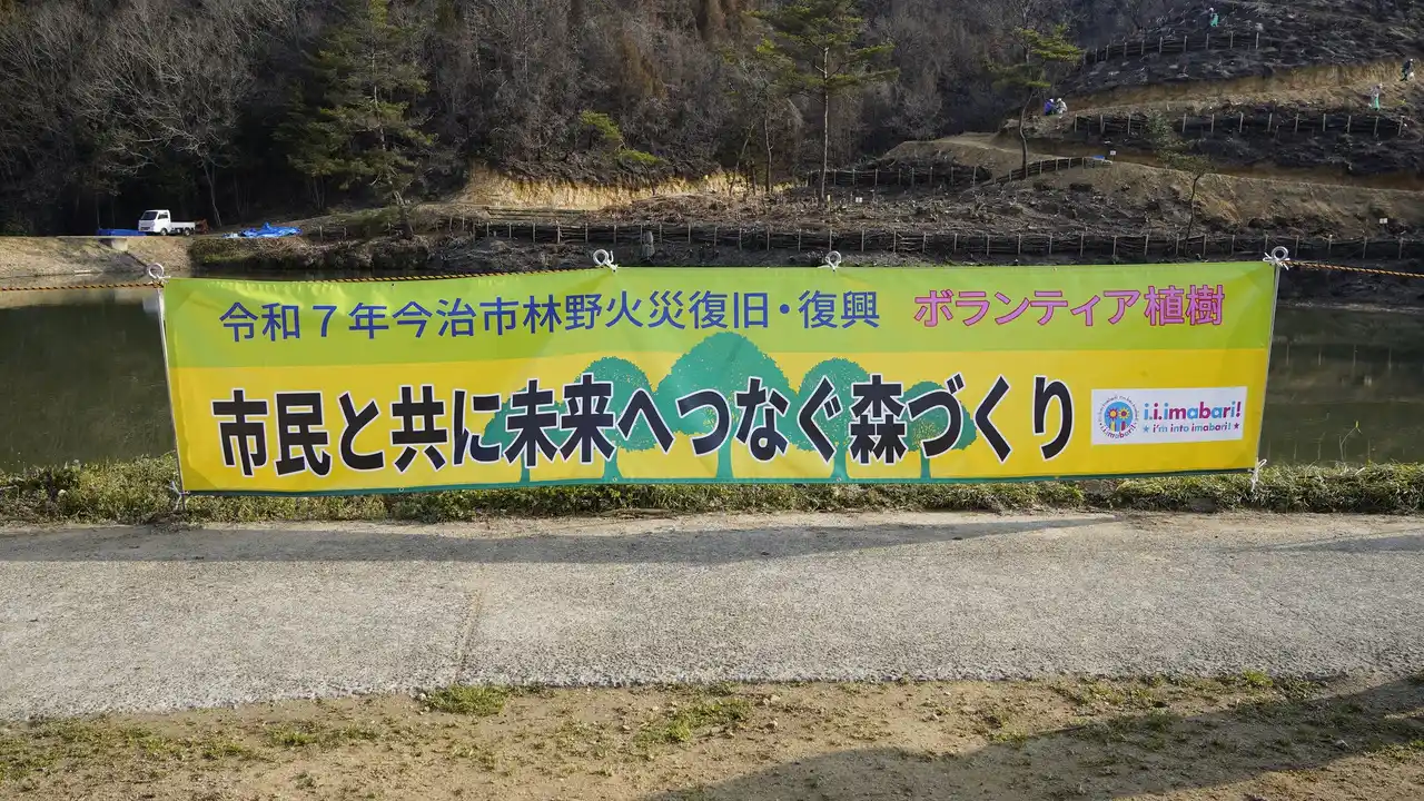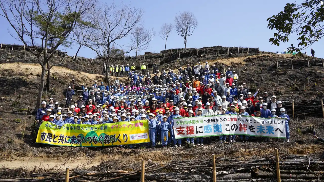 | 3月12日、今治市朝倉地域の被災地で、「令和7年今治市林野火災復旧・復興ボランティア植樹」を実施しました。当日は、地元の朝倉小・中学校の児童生徒、地元自治会、消防団朝倉方面隊、愛媛県などの関係機関、さらには公益財団法人日本財団「HEROs」に参加するアスリートの皆様にもご参加いただき、約350人で復興への第一歩を刻みました。 | |||||||||
