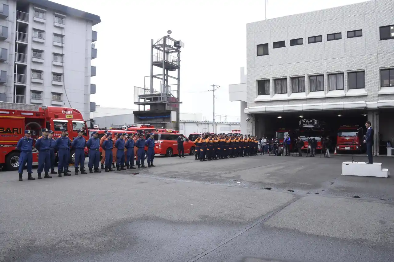 | 発災からちょうど1年となる3月23日には、今治市消防本部庁舎で「今治市消防本部・今治市消防団 防火巡回広報出発式」を開催しました。 | |||||||||
