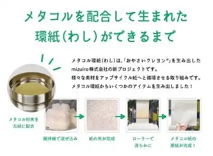 metacol(TM)を配合した紙素材「環紙(わし)」を開発し、 ・帽子 ・封筒 ・ギフトバッグ ・ギフトボックス などの製品化を推進。 |