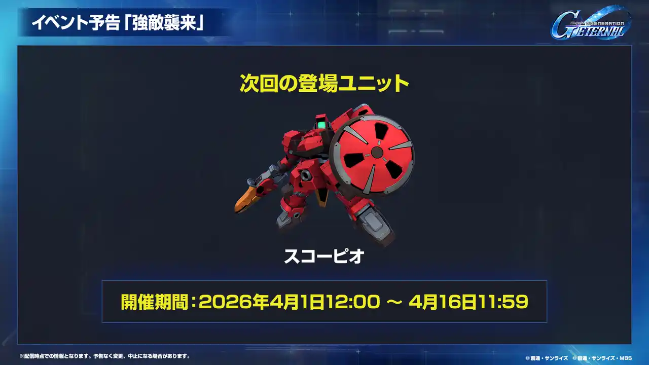 また、4月1日からの「強敵襲来」イベントでは、「スコーピオ」が強敵として新たに登場予定です。イベントを遊んでSSRユニット「スコーピオ」を手に入れましょう! |