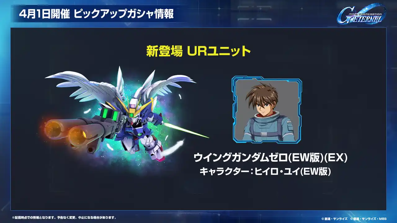 4月1日から開催予定のピックアップガシャには、期間限定ユニットとしてUR「ウイングガンダムゼロ(EW版)(EX)/UR「ヒイロ・ユイ(EW版)」とUR「ダブルオーライザー(最終決戦仕様)(EX)/UR「刹那・F・セイエイ」が登場予定です。さらに、UR「トールギスIII(EX)」とUR「プリベンター・ウインド」と、期間限定サポーターとしてUR「スメラギ・李・ノリエガ&プトレマイオス2」も登場します。 |