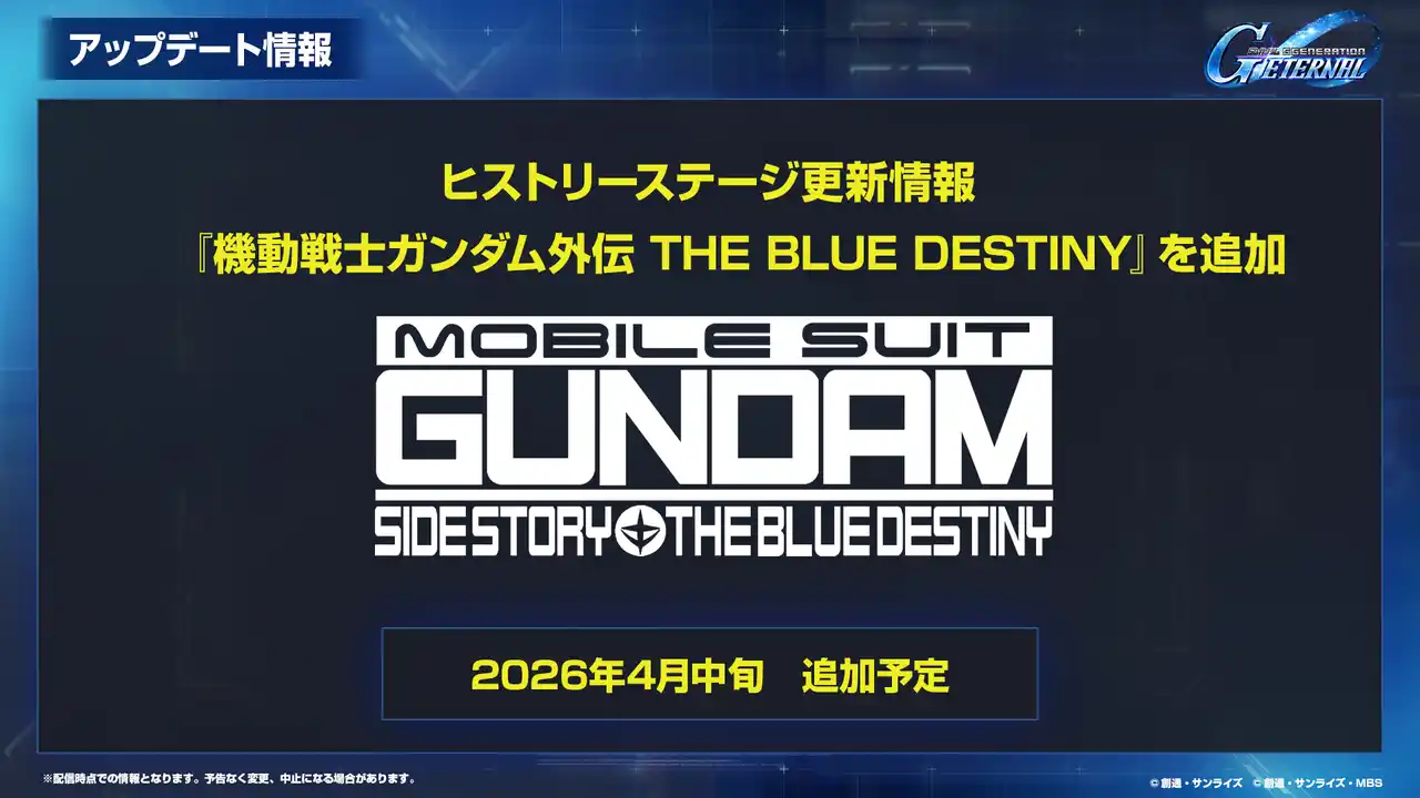 今回は『機動戦士ガンダム外伝 THE BLUE DESTINY』が4月中旬に追加予定です。 |