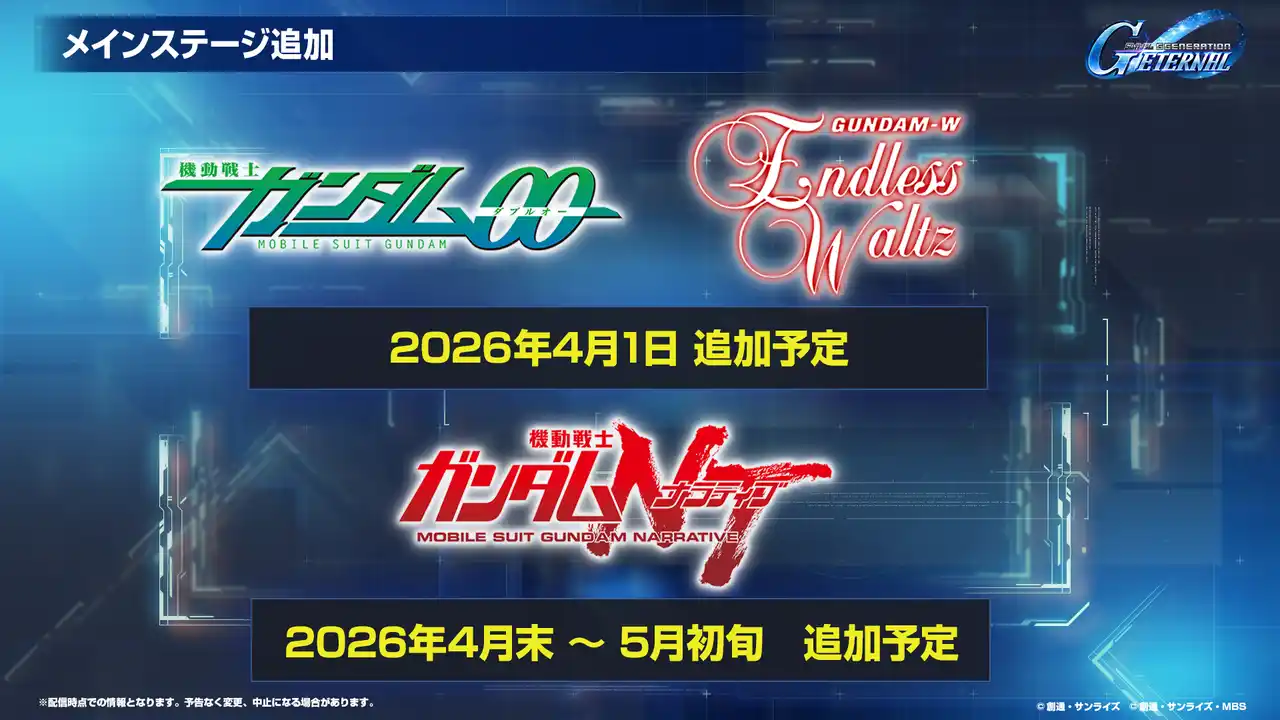 4月1日より『機動戦士ガンダム00』(後半)と『新機動戦記ガンダムW Endless Waltz』がメインステージに追加予定です。 |