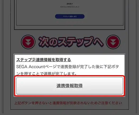 『MJ』の「SEGA Account連携」画面にて、「連携情報取得」をタップ。 |