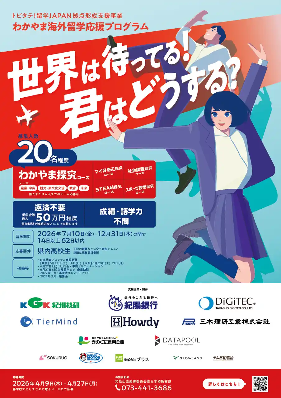 本プログラムでは、「社会課題探究コース」「スポーツ・芸術探究コース」といった「トビタテ!留学JAPAN全国版」と共通のコースのほか、県独自の「わかやま探究コース」を設け、地元の資源を活かし視野を広げる、または海外の文化や技術を和歌山に還元する留学計画を盛り込んでいます。4月9日~4月27日に留学希望者を募集し、初年度は約20名を選出、7月10日~12月31日の間、奨学金支給にて留学を支援します。 |
