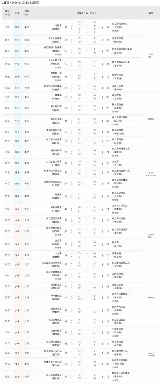本日、2026年3月25日(水)に「第49回全国高等学校ハンドボール選抜大会」の競技2日目が行われ、男女各16試合が実施されました。 2回戦の全試合が終了し、男女それぞれでベスト16が出そろいました。 2連覇中で3連覇を目指した男子・駿台甲府高等学校(山梨)、および昨年大会優勝の女子・高岡向陵高等学校(富山)はいずれも2回戦で敗退しました。 |