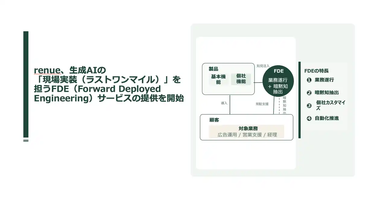 renue株式会社は、生成AIの現場実装(ラストワンマイル)を担うFDE(Forward Deployed Engineering)サービスの提供を開始しました。 |
