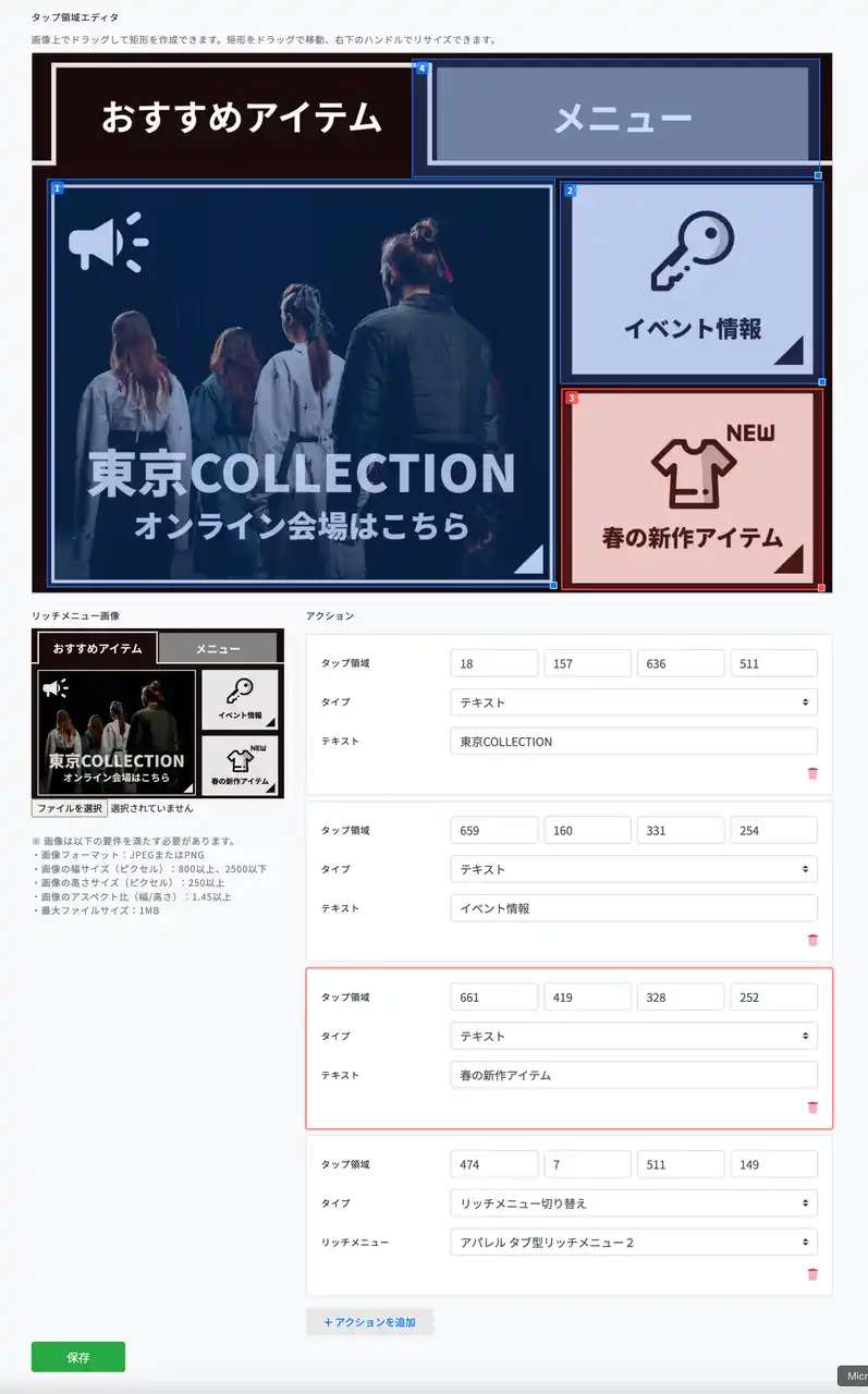 今回のアップデートにより、リッチメニュー画像の上で直接ドラッグ操作するだけでタップ領域を作成・編集できるビジュアルエディタを搭載しました。 |
