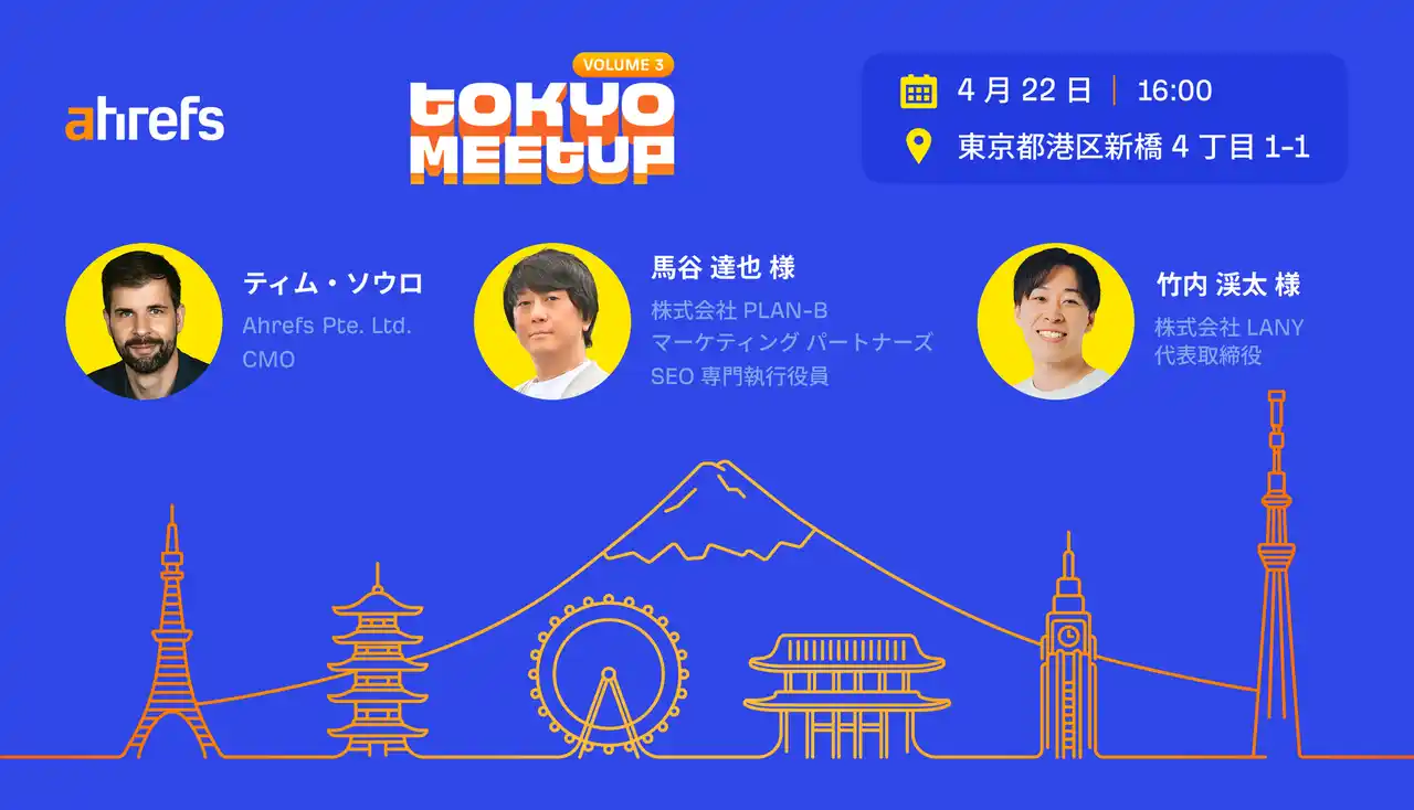 株式会社PLAN-Bマーケティングパートナーズ (本社:東京都品川区、代表取締役:藤野 真弥)は、2026年4月22日(水)に開催される「第3回 Ahrefs 日本ユーザーミートアップ」にて、当社SEO専門執行役員の馬谷が、グローバルSEOツールを提供するAhrefs Pte. Ltd. (CMO ティム・ソウロ氏)、株式会社LANY(代表取締役 CEO 竹内氏)とともに登壇いたします。本セッションでは、AI検索時代に押さえておきたいマーケティング戦略の最前線を深掘りします。 |