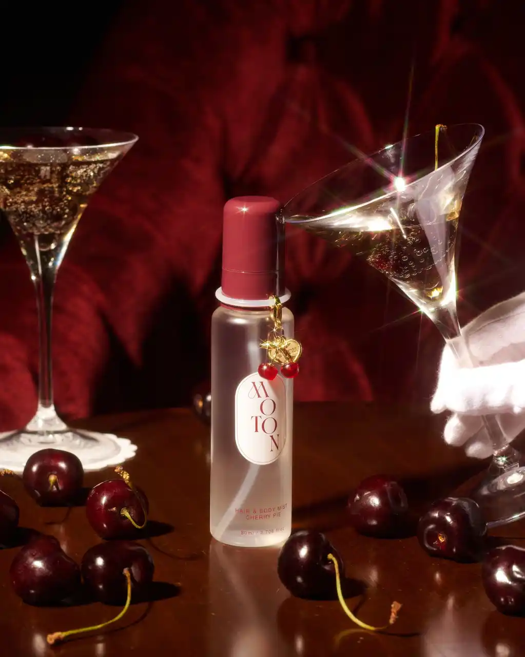 さらに、手元を見るたびに気分が上がる「チェリーめじるしチャーム」もセット。持ち歩くたびに心が弾むような特別なミストです。 |