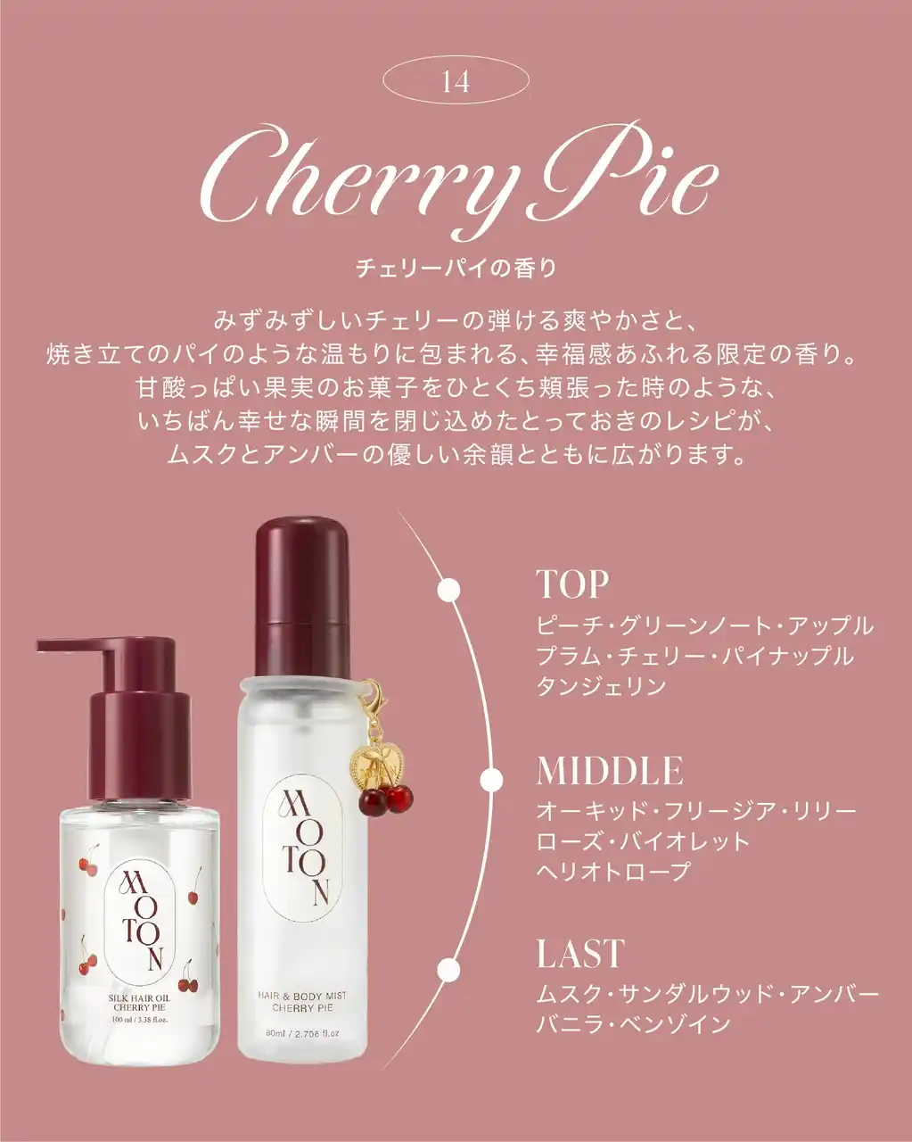 大人気の「ヘア&ボディミスト」と「シルクヘアオイル」から、甘酸っぱさと温かさを纏う、プレミアム香料を使用したチェリーパイの香りが数量限定で新登場。 |