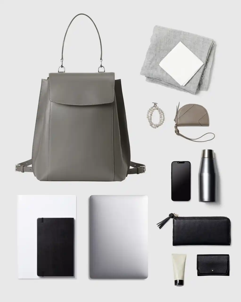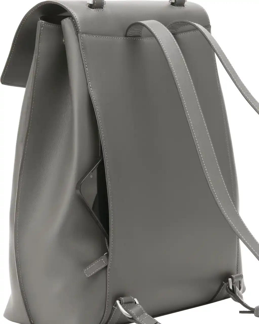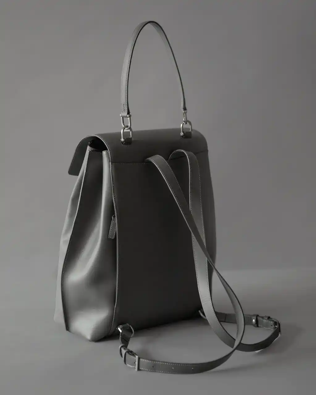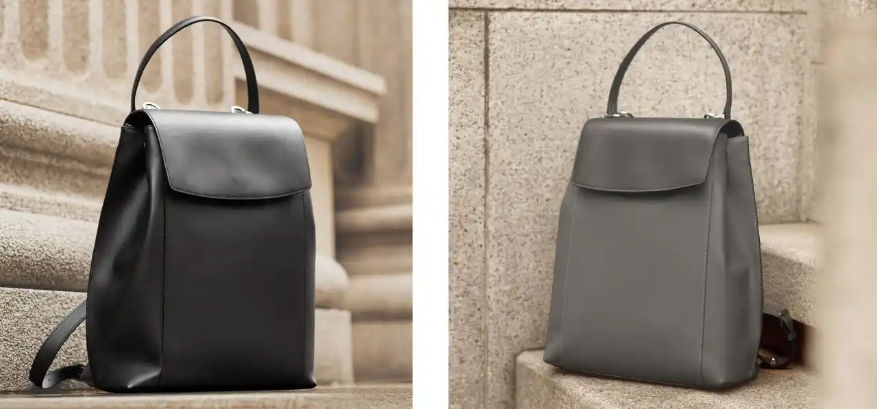ジャケットやブラウスなどのビジネススタイルにも品良く溶け込む、エレガントな佇まいのレザーバックパックです。背負い姿がカジュアルに寄りすぎないようストラップは細く設計し、トップハンドルでワンショルダーの肩掛けにも対応。背負う・肩掛け・置いたときまで、どのシーンでも端正に見える佇まいを追求しました。 |
