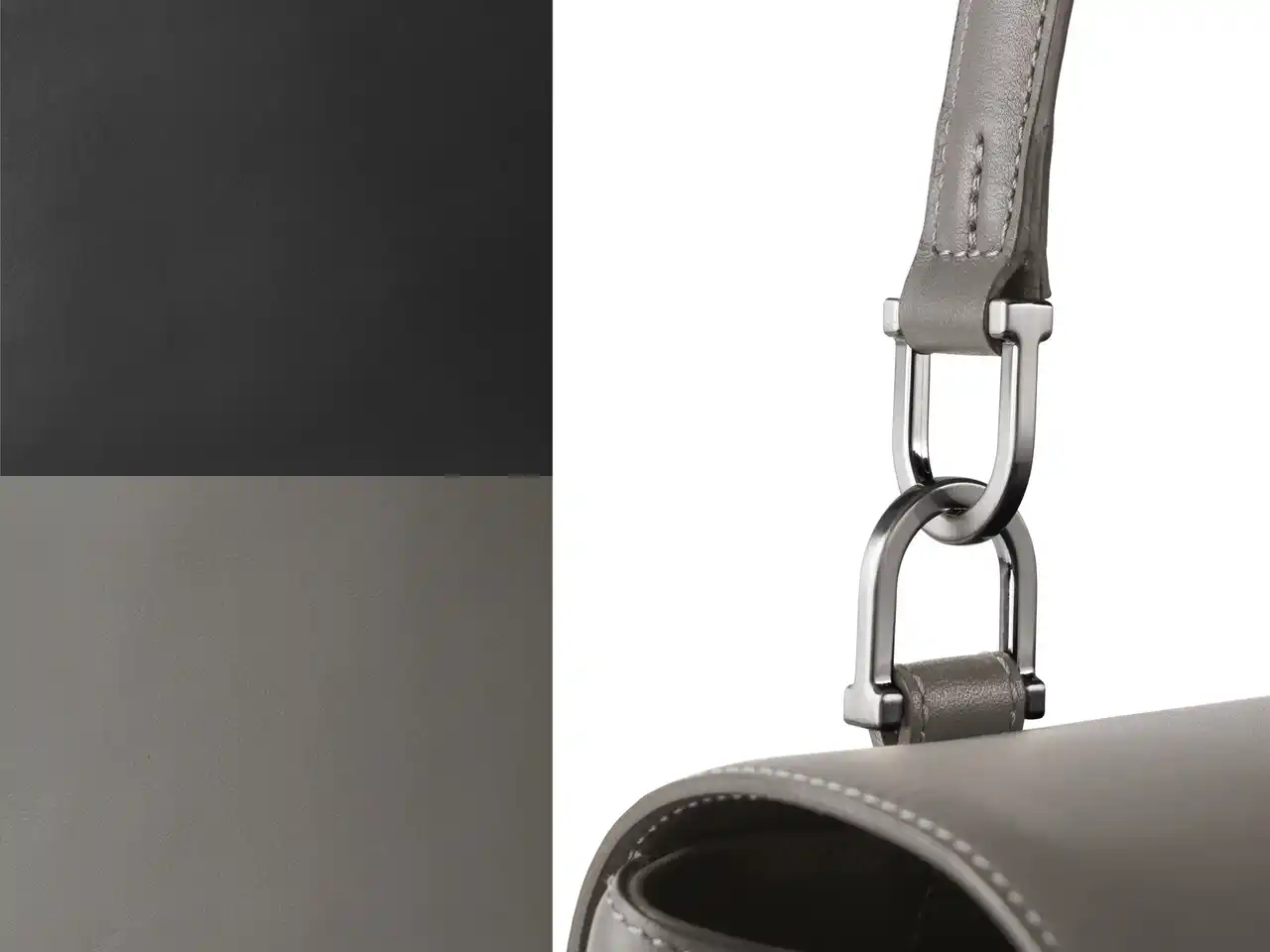 「スチールグレー」は、さまざまなスタイリングに溶け込む、落ち着いたトーンが魅力です。同系色のシルバー金具と調和し、より一層上品な印象を与えます。 |