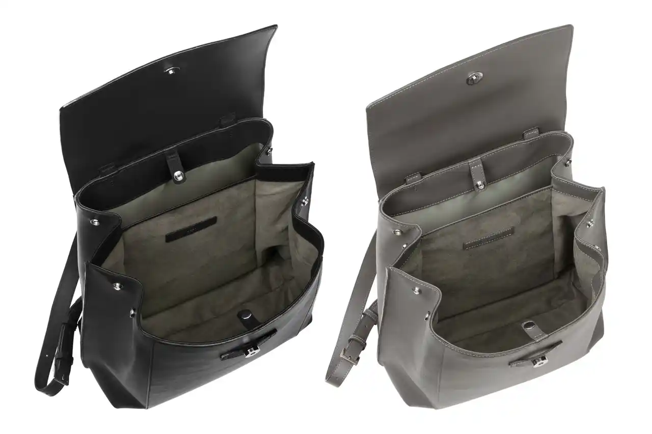 内装カラーは、「ブラック」「スチールグレー」のいずれもグレーを採用し、外装カラーと調和させながら、汚れが目立ちにくい配色としています。ステッチカラーは、「ブラック」には同色のブラック、「スチールグレー」にはグレーをそれぞれ採用。コバ部分も革と同色で統一することで、バックパック全体を品良く、美しい佇まいに仕上げています。 |