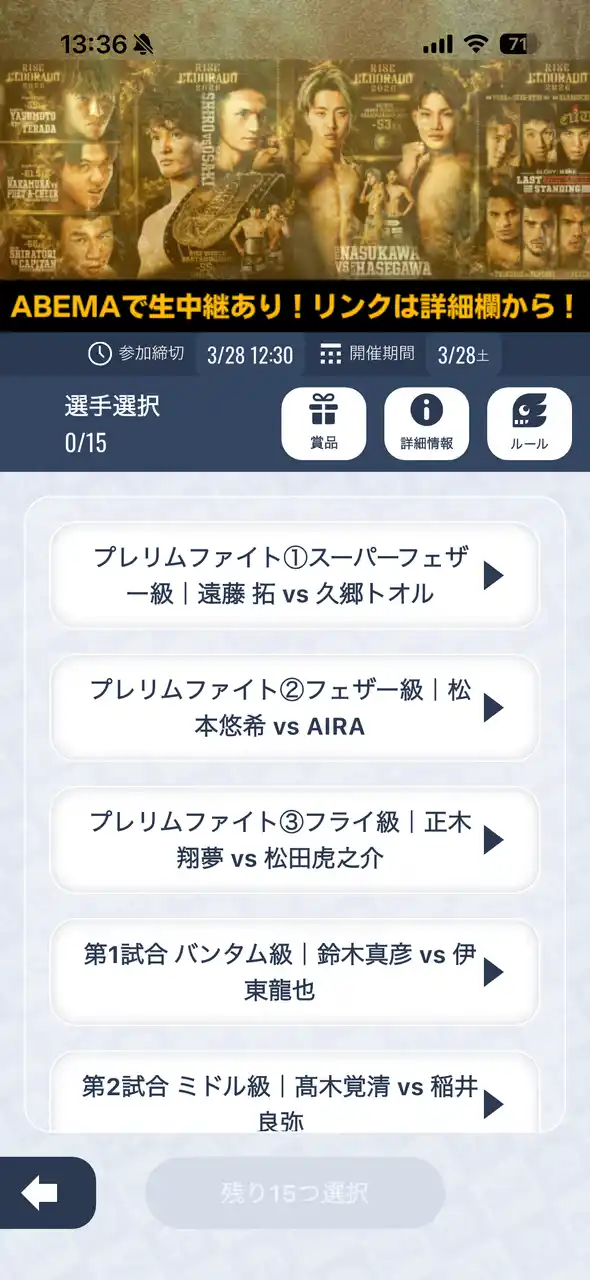 全15試合の勝敗を予想(選手 × KO・TKO勝ち/選手 × 判定勝ち/引き分け) |