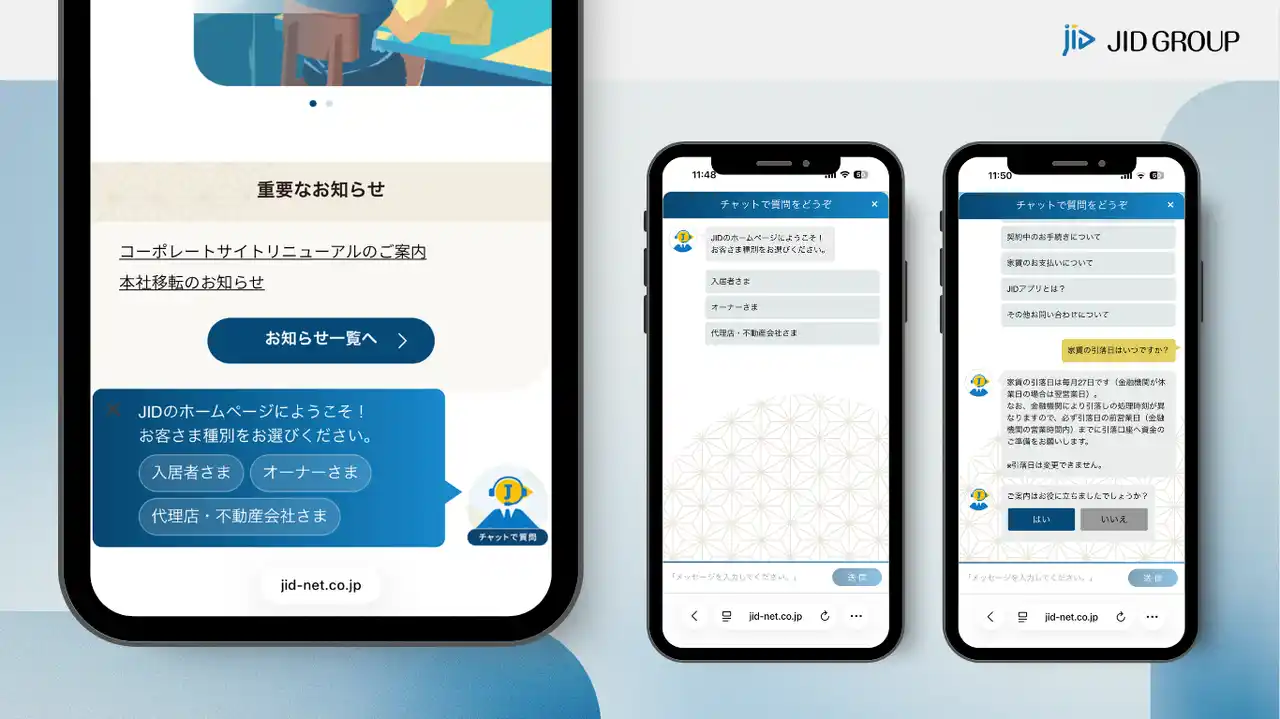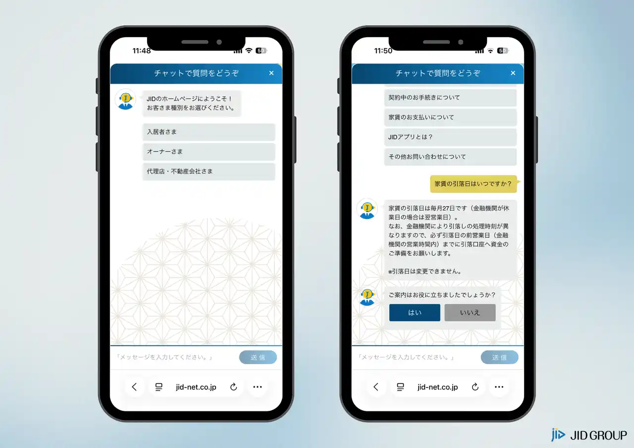 | 今後はAIチャットボットの対応範囲を順次拡大し、すべてのステークホルダーの皆様にJIDの賃貸保証システムを快適にご利用いただけるよう、利便性の向上に努めてまいります。 | |||||||||||||