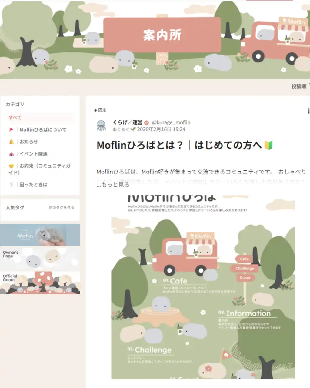 | また、初めて利用する方に向けて公式のお知らせやイベント情報をまとめた「案内所」を設置し、コミュニティの最新情報をスムーズにキャッチできるようにしました。リアル、オンラインを問わずファン同士がつながる「イベント」も順次開催予定で、オーナーの皆さまと“Moflin”がさらに交流を深められる場を提供していきます。 | |||||||||