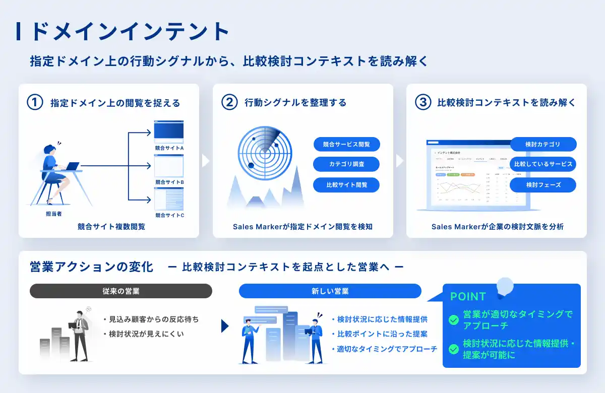 営業・マーケティング支援SaaS『SalesMarker(セールスマーカー)』を開発・提供する株式会社Sales Marker(本社:東京都渋谷区、代表取締役 CEO:小笠原 羽恭、以下:当社)は、企業が指定した外部ドメイン上のシグナル*を活用する新機能「ドメインインテント」の提供を開始しました。これにより、競合サービスへの関心やカテゴリ探索といったシグナルを起点に、顧客の比較検討コンテキストをより捉えやすくなります。 |