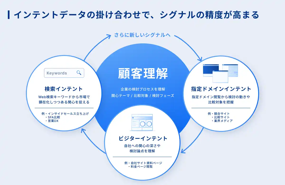 ドメインインテントの価値は、単独のシグナルとして完結することではなく、複数シグナルを掛け合わせることで、顧客理解の精度をさらに高められる点にあります。これにより、顧客の関心テーマや検討の具体化の度合いに応じて、どのような情報提供や提案設計が適切かを見極めやすくなり、営業・マーケティングの判断を実務に活かしやすくなります。 |
