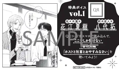 今回ももちろん、No.1ホスト・佐々木蓮役を花江夏樹さん、社畜・鈴木直人役を八代拓さんが担当! |