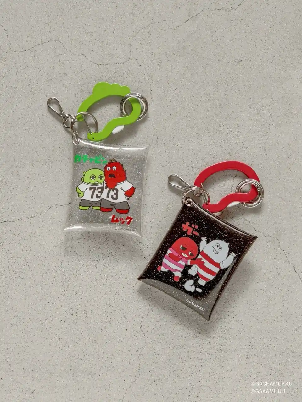 カラビナ付きのクリアポーチ。PVC 素材のポーチはカードやリップが入るサイズ感で、小物入れとして使いやすいアイテムです。ポーチは細かいラメ、カラビナにはガチャピンとガーのシルエットをデザインに落とし込み、他にはないアイテムに仕上げました。キーホルダーとしてお使いいただくのもおすすめです。 |