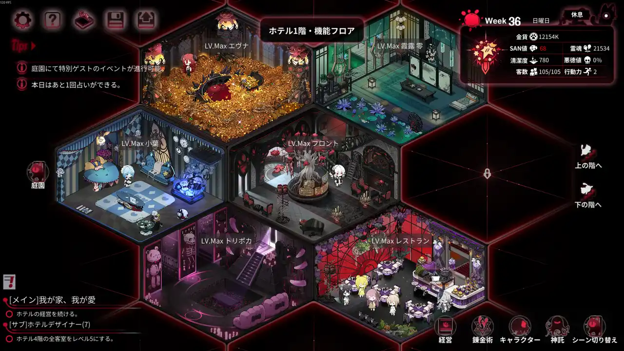 また、レストランや客室改築といったホテル運営に加えて、探索・錬金術・SAN値(正気度)を削って強力な効果が得られる『神託(オラクル)』など、“クトゥルフ神話らしい”ダークな決断も迫られる本作。まさに【あなたの経営判断とヒロインとの絆が運命を変える、混沌が這い寄る世界の、魅惑で狂気なホテル経営シミュレーション】です。 |