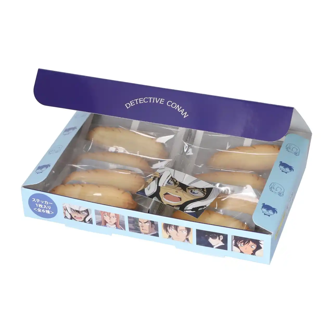 卓越したバイクテクニックから「風の女神」と称される、萩原千速をイメージした羽の形のプレーン味のクッキーです。江戸川コナン、萩原千速などのキャラクター全6種のステッカーをランダムで封入しています。 |