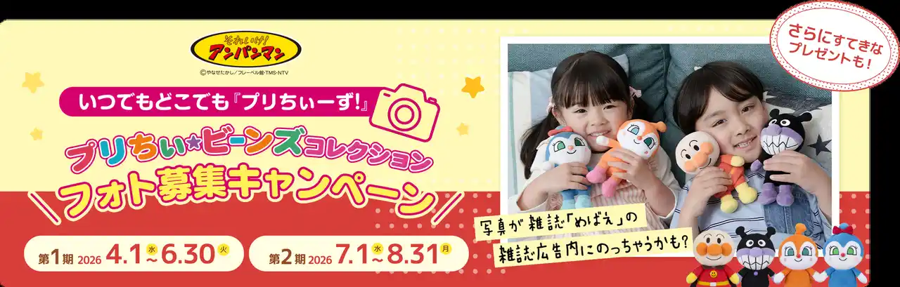 アニメ「それいけ!アンパンマン」に登場するキャラクターのぬいぐるみ『プリちぃビーンズ コレクション』※とお子さまが一緒に写った“とっておきの1枚”をぜひご応募ください。 |