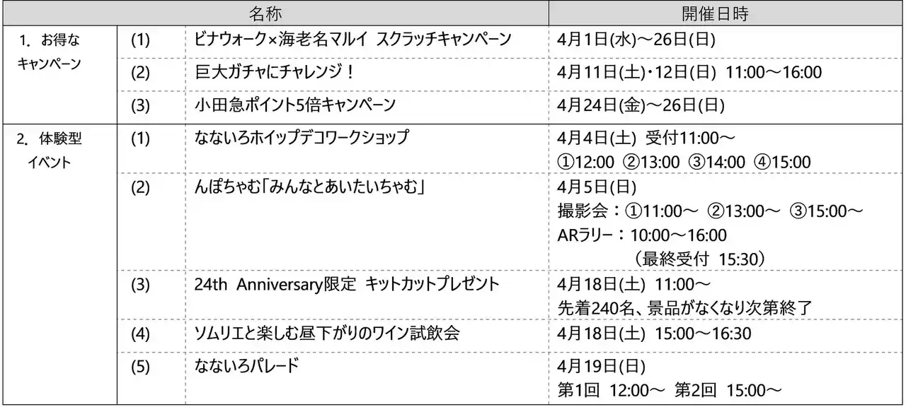 株式会社小田急SCディベロップメント(本社:東京都新宿区 取締役社長:細谷 和一郎)が運営する海老名駅直結の商業施設「ビナウォーク」は、開業24周年を記念し、2026年4月1日(水)から26日(日)までの26日間、『ビナウォーク24周年アニバーサリー』を開催します。 |