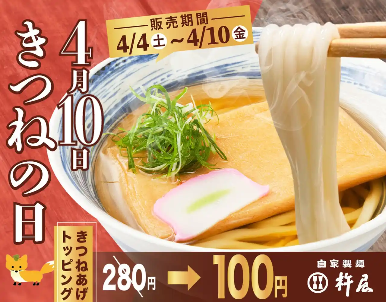 【株式会社グルメ杵屋】 【自家製麺 杵屋】4月10日は「きつねの日」名物きつね揚げを100円で楽しむ一週間