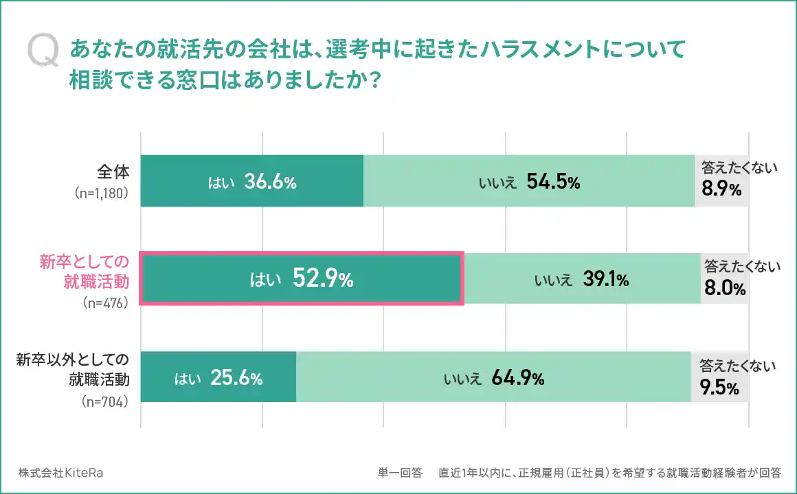 「安心して働ける世界をつくる」をミッションに掲げ、社内規程DXサービスとして企業向け「KiteRa Biz(キテラビズ)」と社労士向け「KiteRa Pro(キテラプロ)」を提供する株式会社KiteRa(代表取締役 執行役員 CEO:植松隆史、本社:東京都港区、読み:キテラ、以下「当社」)は、2026年2月26日に発表した「就活セクハラに関する実態調査」の続報として、直近1年以内に正規雇用(正社員)を希望して就職活動を行った求職者1,180名の”新卒/既卒別”の調査結果を発表します。 |