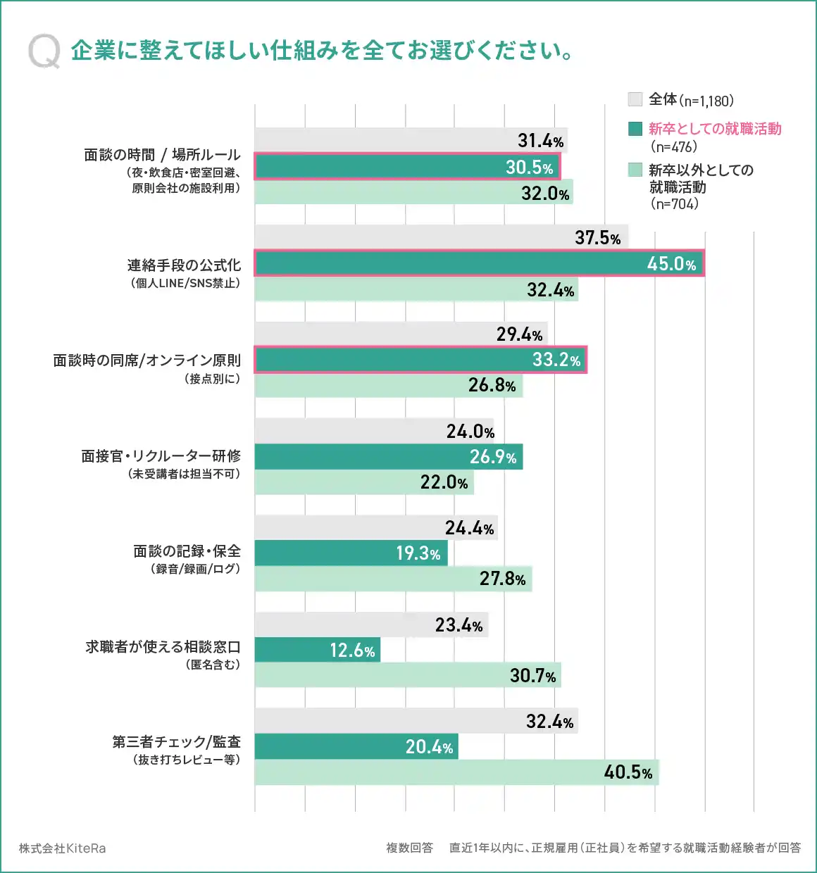 新卒以外としての就職活動では、「第三者チェック/監査(抜き打ちレビュー等)」が40.5%と最多、次いで「連絡手段の公式化(個人LINE/SNS禁止)」が32.4%、「面談の時間/場所ルール(夜・飲食店・密室回避、原則会社の施設利用)」が32.0%、「求職者が使える相談窓口(匿名含む)」が30.7%でした。 |