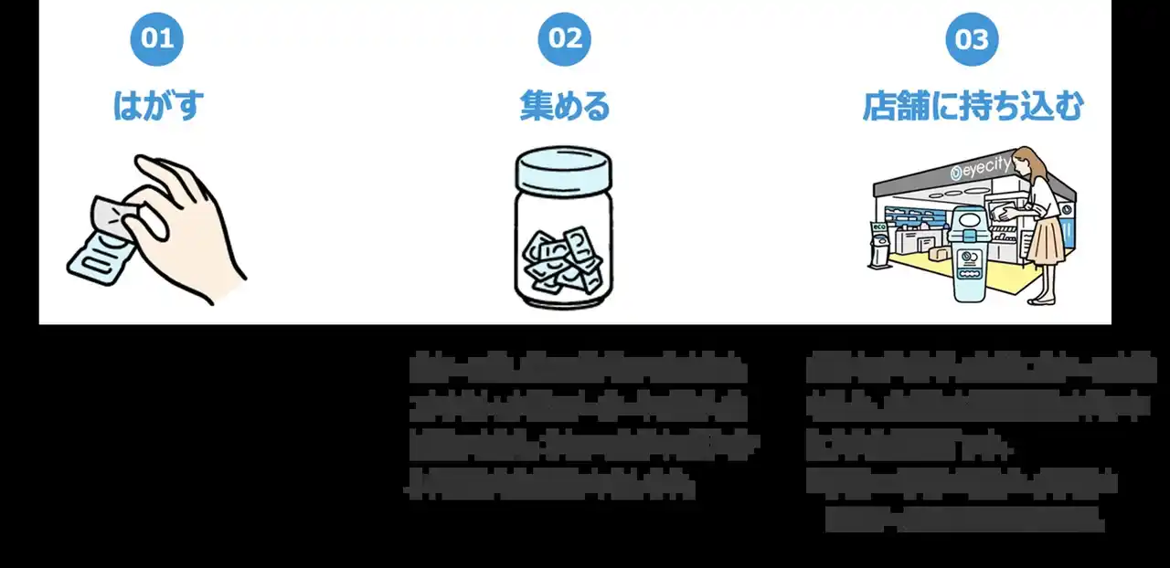 「アイシティ ecoプロジェクト」は、リサイクルが可能な使い捨てコンタクトレンズの空ケースを対象に、全国のアイシティ店舗に加え、活動にご賛同いただいた自治体・企業・学校など全国約8,800箇所に専用ボックスを設置して回収するリサイクル活動です。3つの社会貢献(1.空ケースの再資源化による環境保全、2.障がい者の自立・就労支援、3.日本アイバンク協会への寄付)へとつないでいくことを目的として、2010年より業界で初めてこの活動をスタートし、今年で活動期間は16年目を迎えました。 |