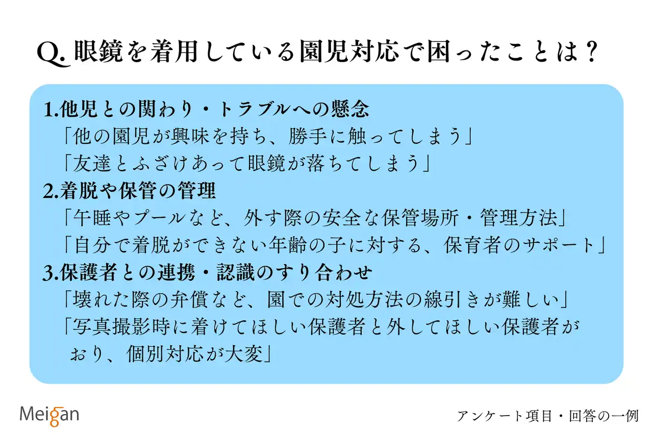 | 弱視治療などに用いられる「治療用メガネ」は、視覚機能発達のために日中の継続的な装用が不可欠です。しかし、2023年11月の山口県医師会議事録で「保育現場での入園拒否・装用拒否」の事例が報告され、眼科5団体の連盟からも理解を求める文書が発行されるなど、周囲の理解不足が課題となっています。 | |||||||||