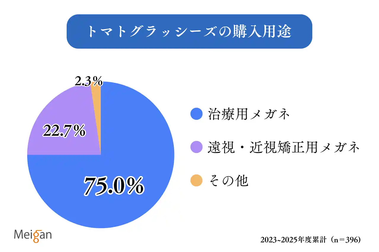 | 名古屋眼鏡は、こども用メガネ「トマトグラッシーズ」の日本国内総代理店として15年以上国内流通に携わってきました。トマトグラッシーズの購入者向けアンケートによると、約75%の購入者に「弱視・斜視の治療用メガネ」として使用いただいています(n=396)。 | |||||||||